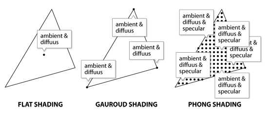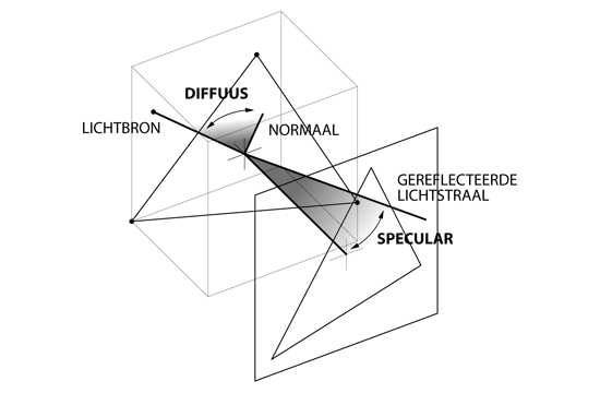 Ambient is licht gereflecteerd door alle voorwerpen in een omgeving. Diffuus licht wordt gereflecteerd door het oppervlak van een voorwerp. Afhankelijk van het materiaal waaruit het voorwerp bestaat, wordt licht in meer of mindere mate verstrooid gereflecteerd. Specular of hooglicht ontstaat wanneer een gereflecteerde lichtstraal het oog van de toeschouwer treft. Afhankelijk van de eigenschappen van een voorwerp zal hooglicht wel of niet zichtbaar zijn. Vilt reflecteert licht in vele richtingen, waardoor het licht verstrooid wordt en er niet of nauwelijks hooglicht zichtbaar is. Metaal heeft een vrij dicht en egaal oppervlak, waardoor licht minder verstrooid wordt en hooglicht zichbaar is als de gereflecteerde lichtstralen het oog treffen.