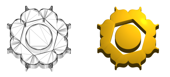 Virtuele voorwerpen worden in veel gevallen beschreven met behulp van polygonen. Eén enkele polygoon is op zich niet zo interessant. Meerdere polygonen kunnen een virtueel voorwerp representeren, bijvoorbeeld het logo van Fronteers.